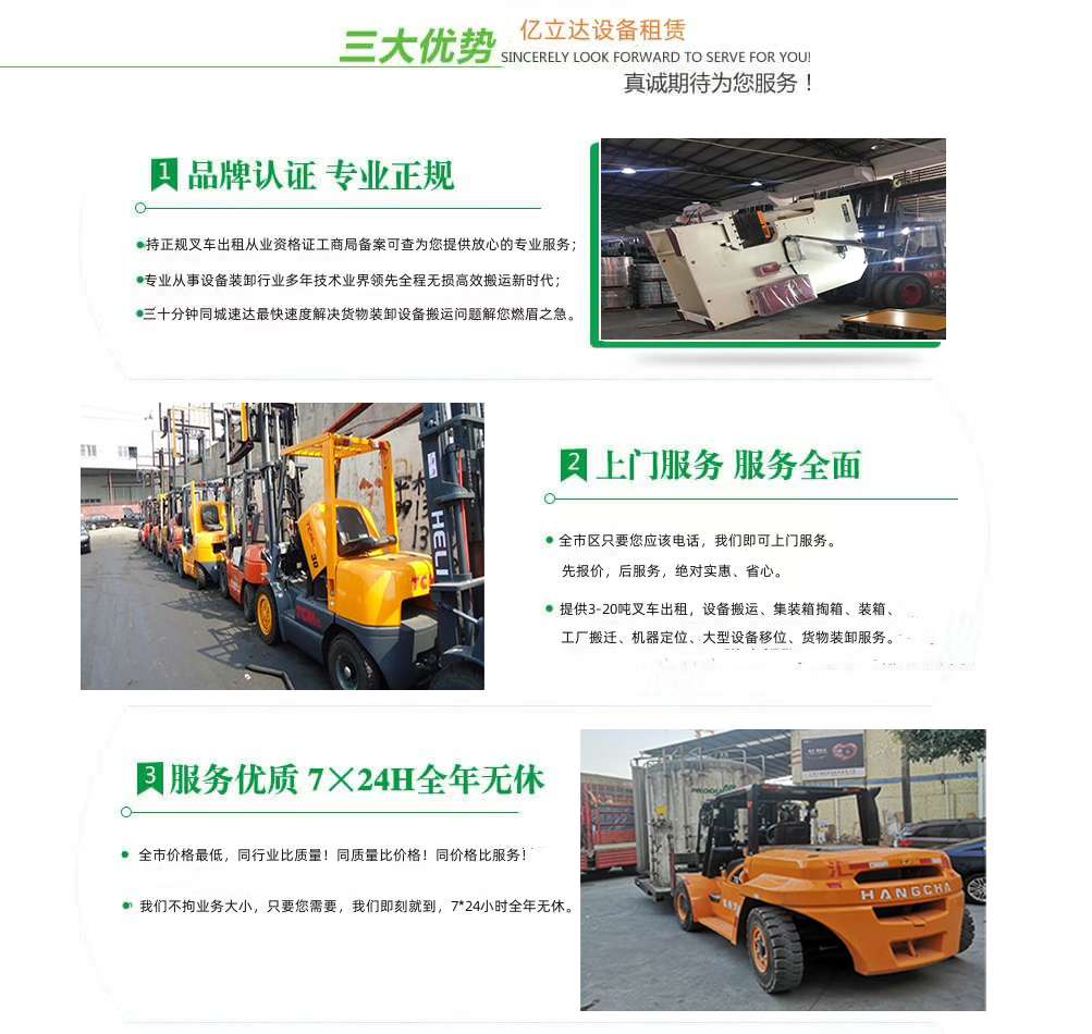 亿立达设备租赁有限公司是工商局准许的石家庄新华区专业叉车出租公司,公司本着诚信、服务、效率、创新的经营理念,用精湛的技术,真诚的服务,为众多客户提供优质的服务,同时获得信赖与支持。专业提供石家庄新华区3-20吨叉车出租、叉车租赁、设备搬运、集装箱掏箱装箱、机器移位定位、货物装卸、工厂搬迁、安全可靠,收费透明,价格便宜,随叫随到,24小时上门服务!本公司叉车吊车师傅对各种设备搬运装卸都有深刻探讨和研究。很多的疑难设备搬运,通过我公司的叉车师傅都能迎刃而解。对各种进口设备、国产机器、大型设备搬迁、高难度搬迁、各种精密仪器、医疗设备、科研设备等都能搬运; 提供全市 24 小时上门装卸搬运服务。同时提供厂房搬迁服务。 ...